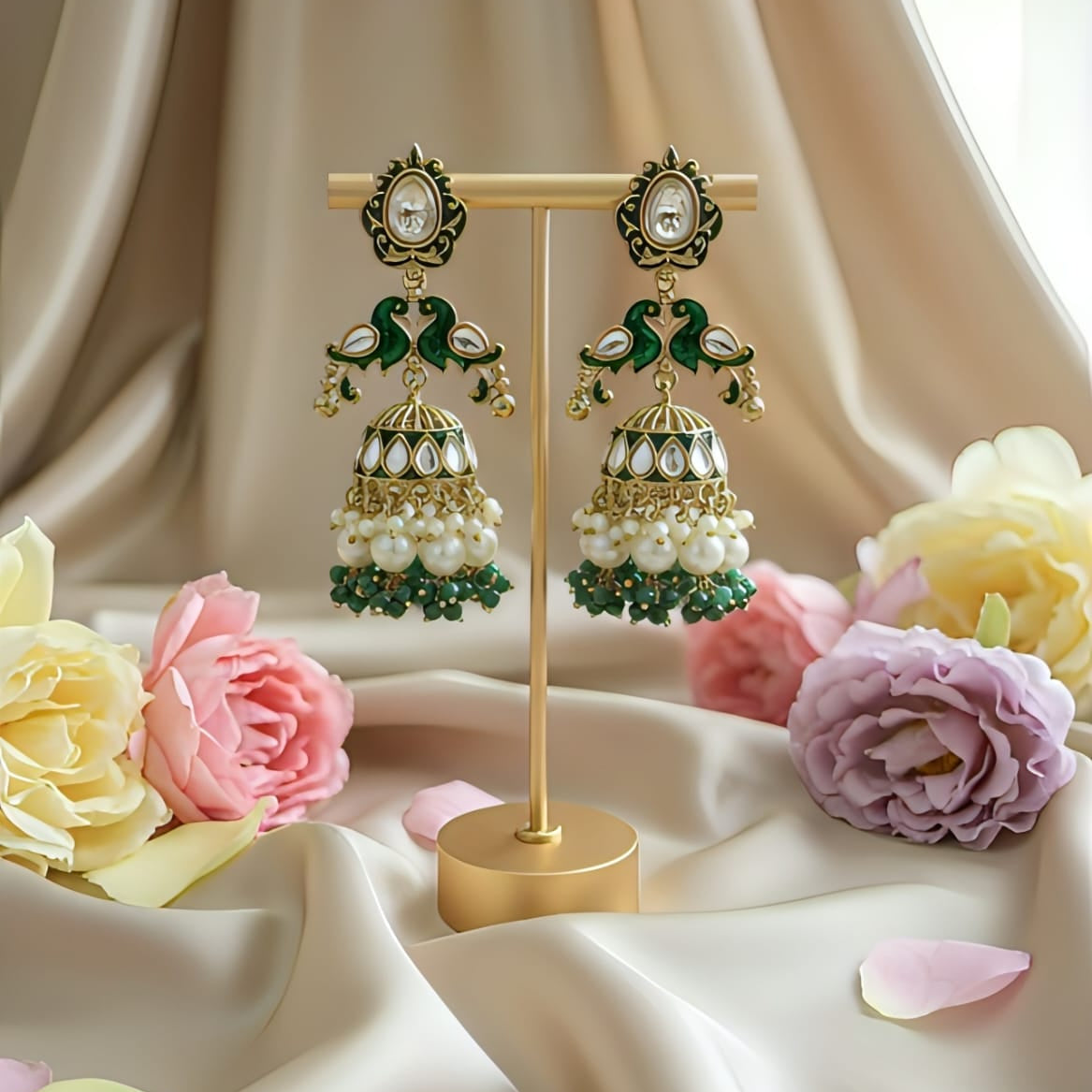 - Design: Dome-shaped jhumkas with floral top and peacock motif